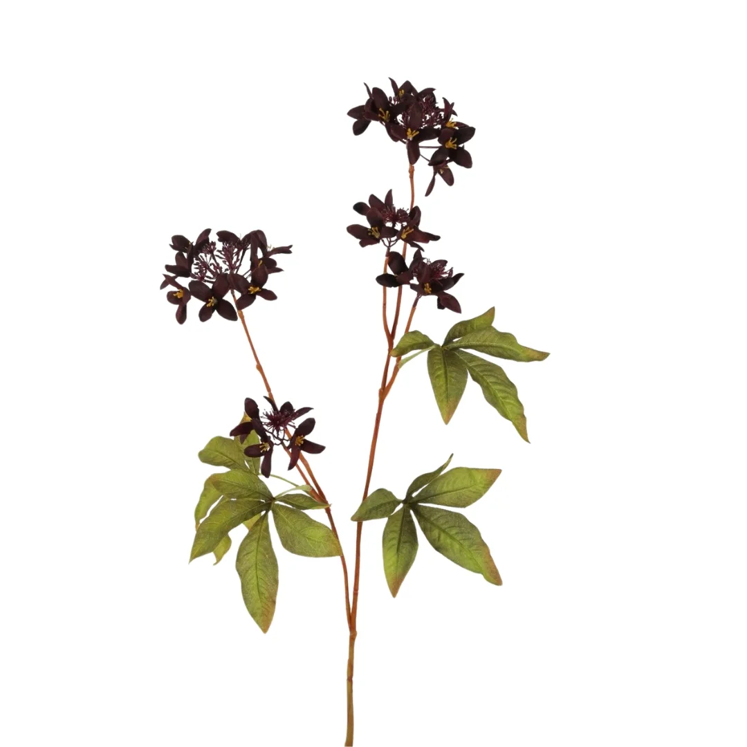 Breng een unieke en stijlvolle sfeer in huis met deze kunstbloem. De diep donkerpaarse bloemen vormen een prachtig contrast met het frisse groene blad en zorgen voor een warme, elegante uitstraling. Dankzij de verfijnde details lijkt deze tak levensecht, maar zonder het onderhoud van echte bloemen.